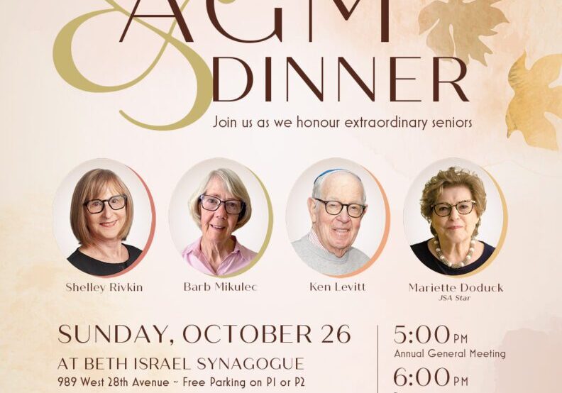 Join us as we honour extraordinary seniors. Sunday, October 26th at Beth Israel Synagogue989 West...