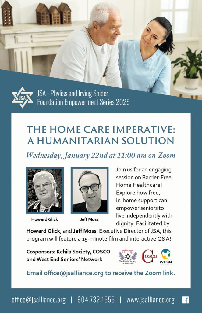 Join us for an engaging session on Barrier-Free Home Healthcare! Explore how free, in-home support can empower seniors to live independently with dignity. Facilitated by Howard Glick, and Jeff Moss, Executive Director of JSA, this program will feature a 15-minute film and interactive Q&A!