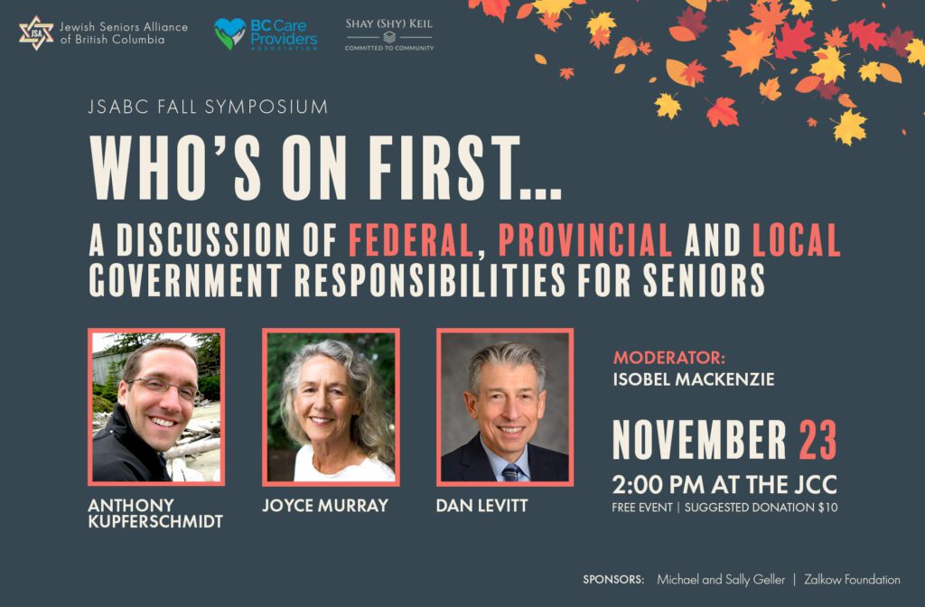 On Sunday November 23rd, we will be hosting our Fall Symposium at the JCC, featuring Anthony Kupferschmidt, Dan Levitt, and the Honourable Joyce Murray in an important discussion on the state of seniors at the city, provincial, and federal levels of government.